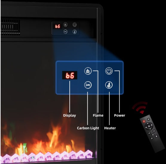 Flexible Control Modes: The electric fireplace has a remote control, heating temperature control (62°F to 95°F), and time setting (0.3-9 hours) to make fireplace operation simple.