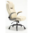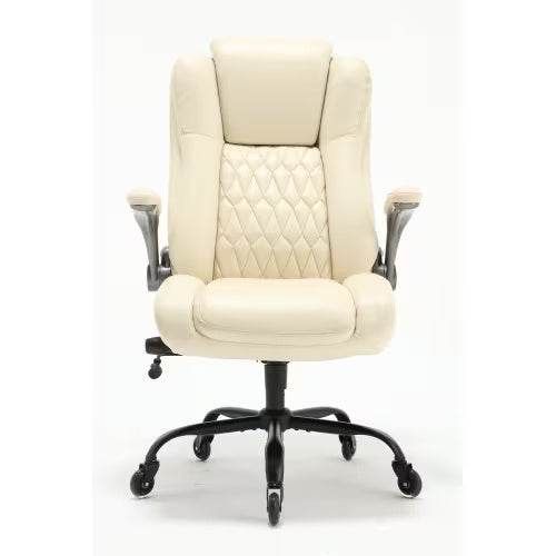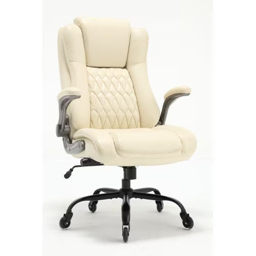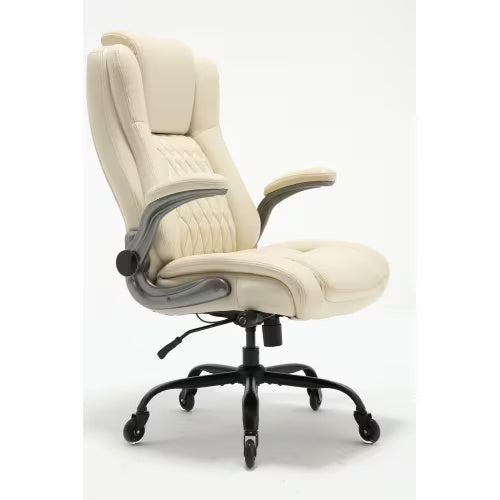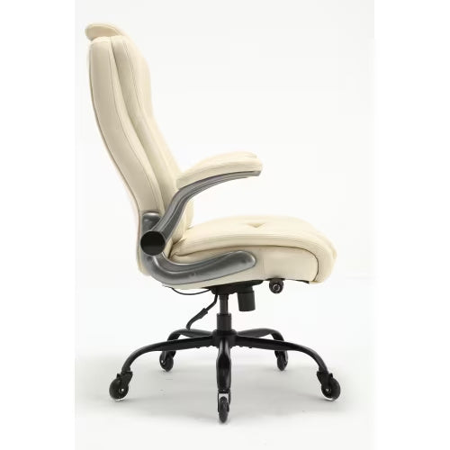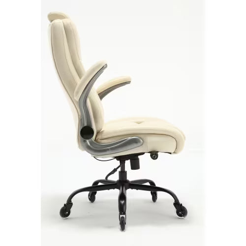 - Concerned about whether your leather office chair will be suitable for your compact workspace? The flip-up armrests offer flexibility for easy adjustment and storage, optimizing space when not in use. The seat height is adjustable to accommodate various office items, while the chair's 300 lb. weight capacity caters to larger individuals. With its spacious seat, transitioning in and out of the work chair is effortless and comfortable.